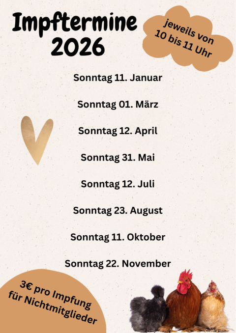 Der Geflügelzuchtverein Bürgstadt 1939 e. V. führt die NC Impfung für Hühner und hühnerartiges Geflügel (Wachtel, Fasanen usw.) in der Zuchtanlage in Bürgstadt am Fleckenweg (Radweg Richtung Freudenberg) durch.